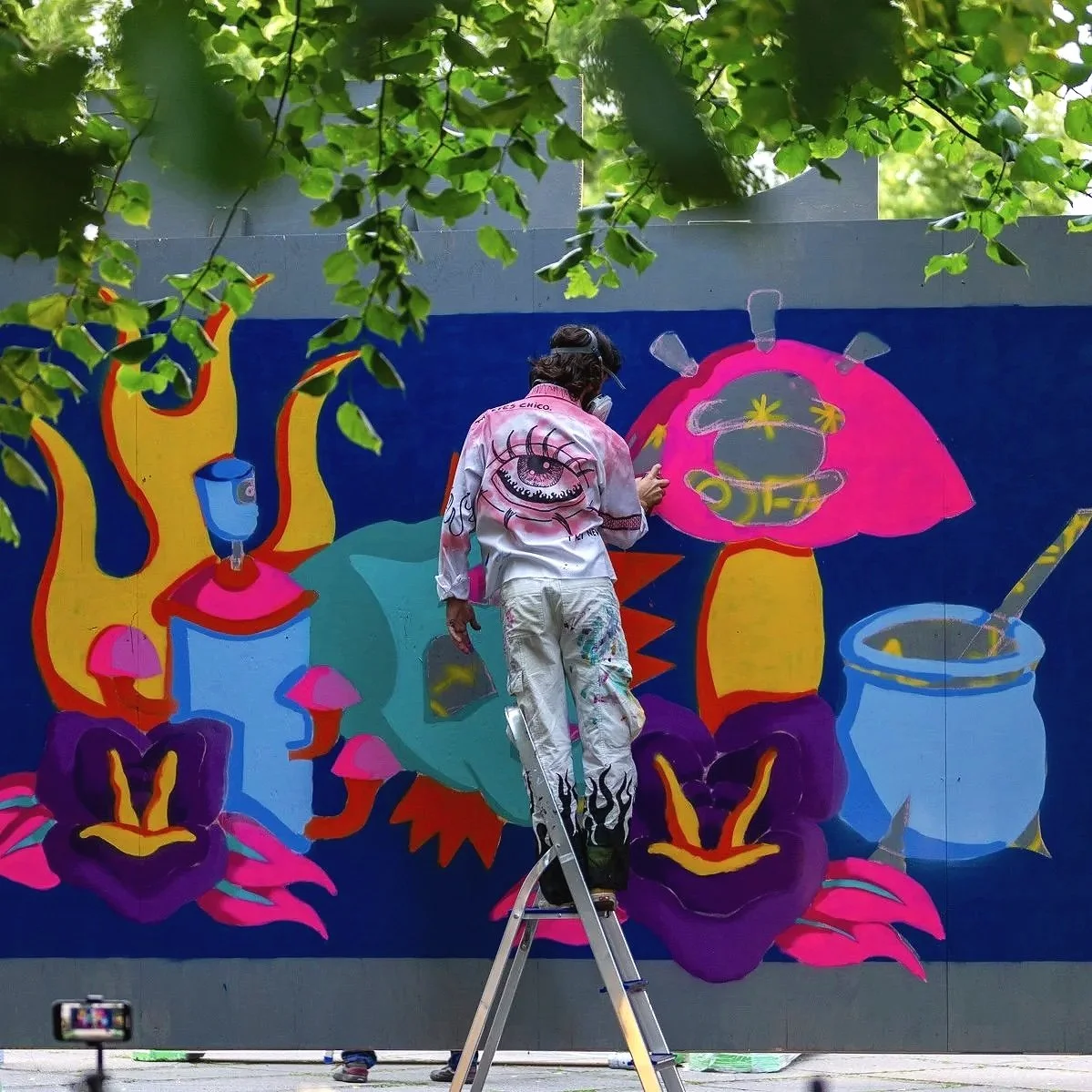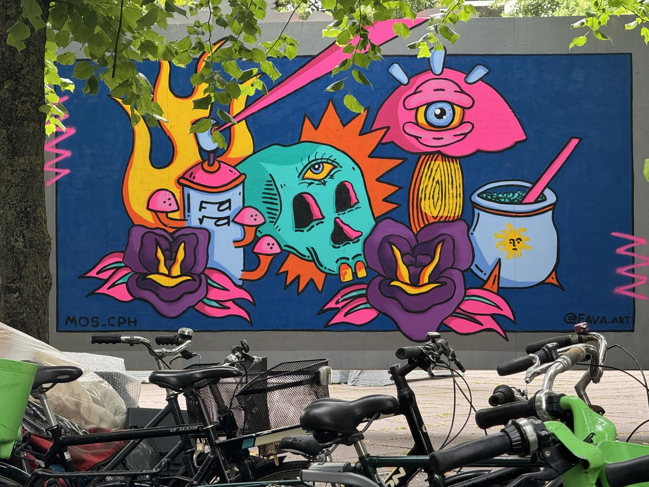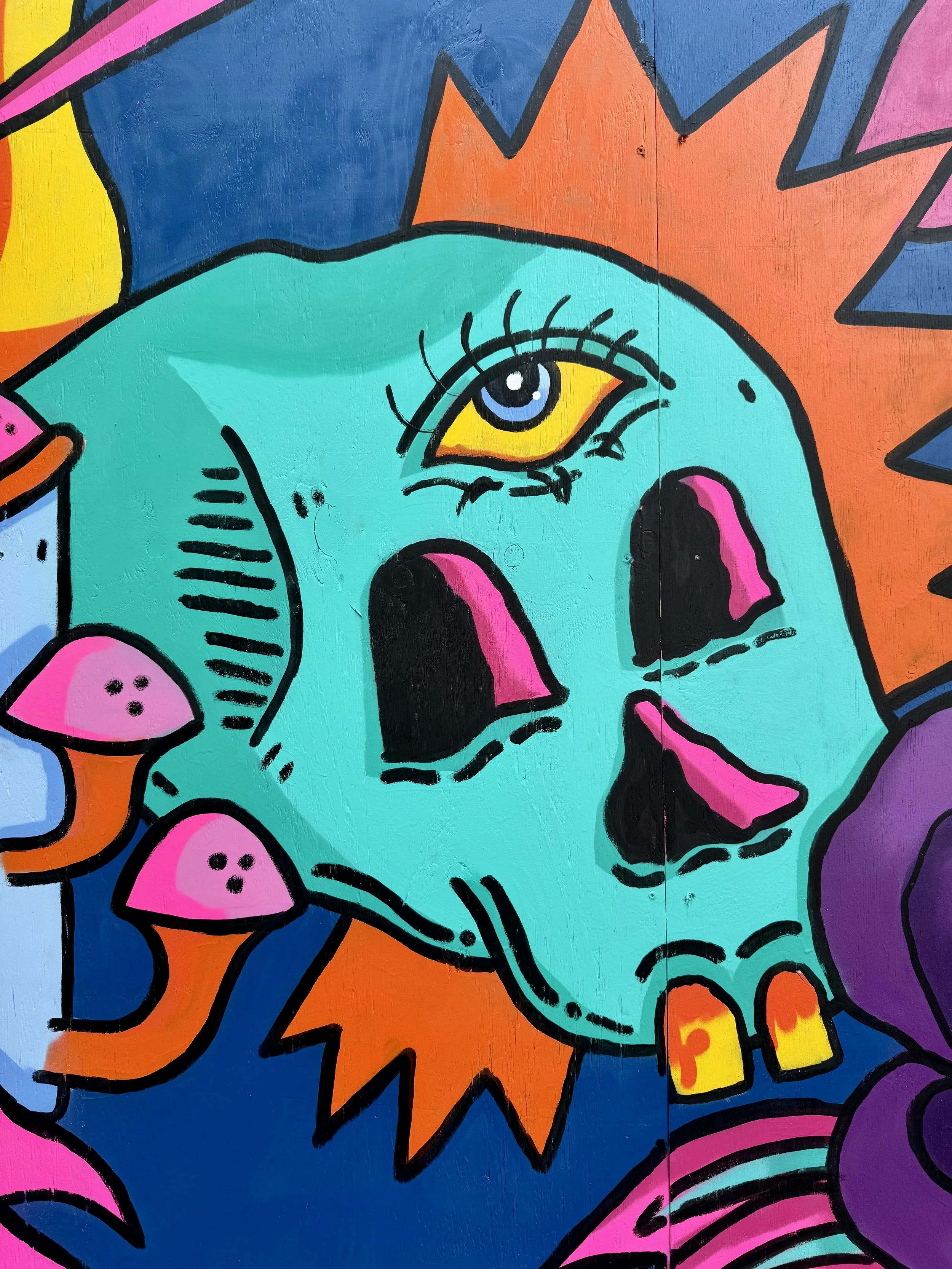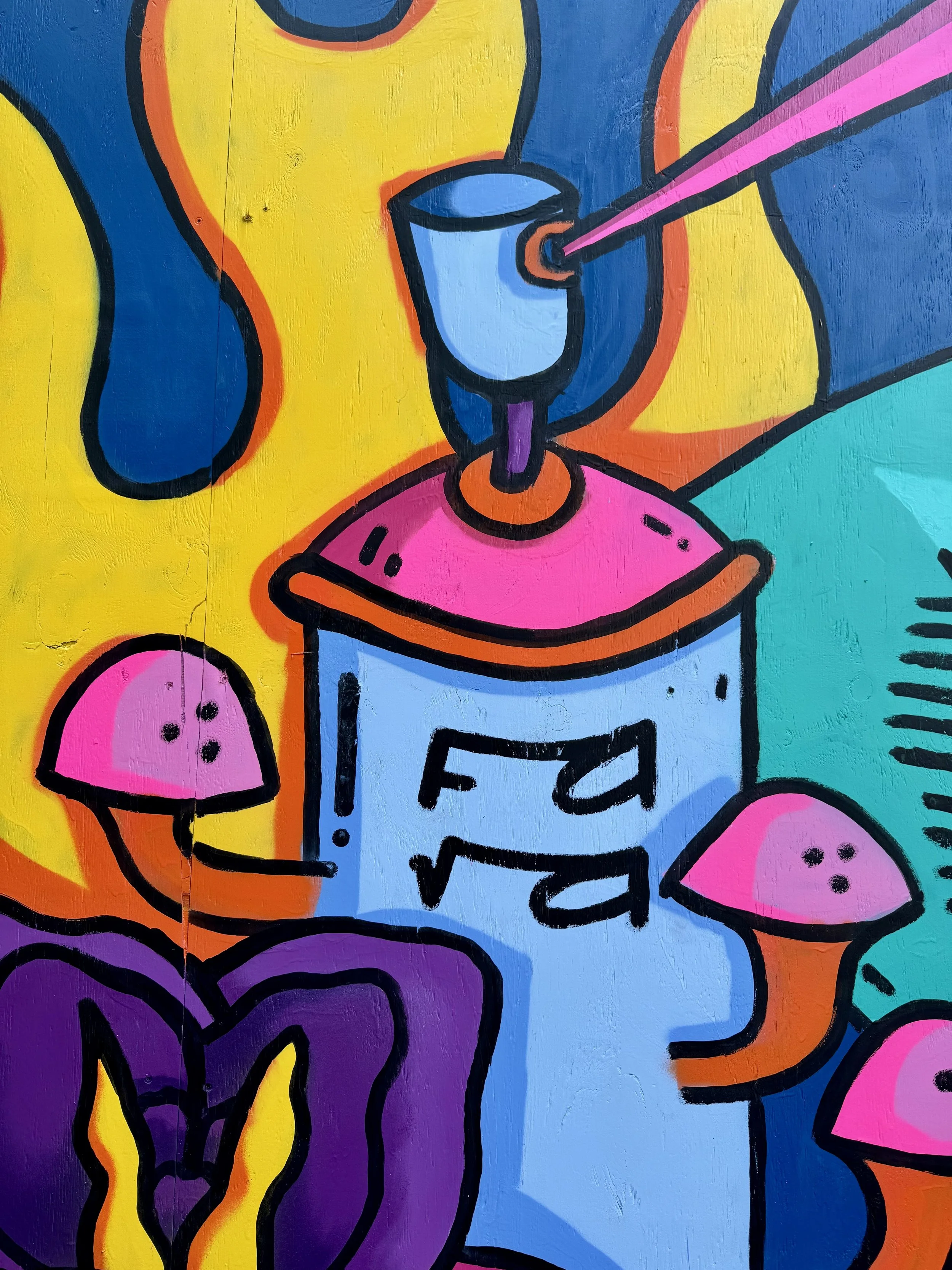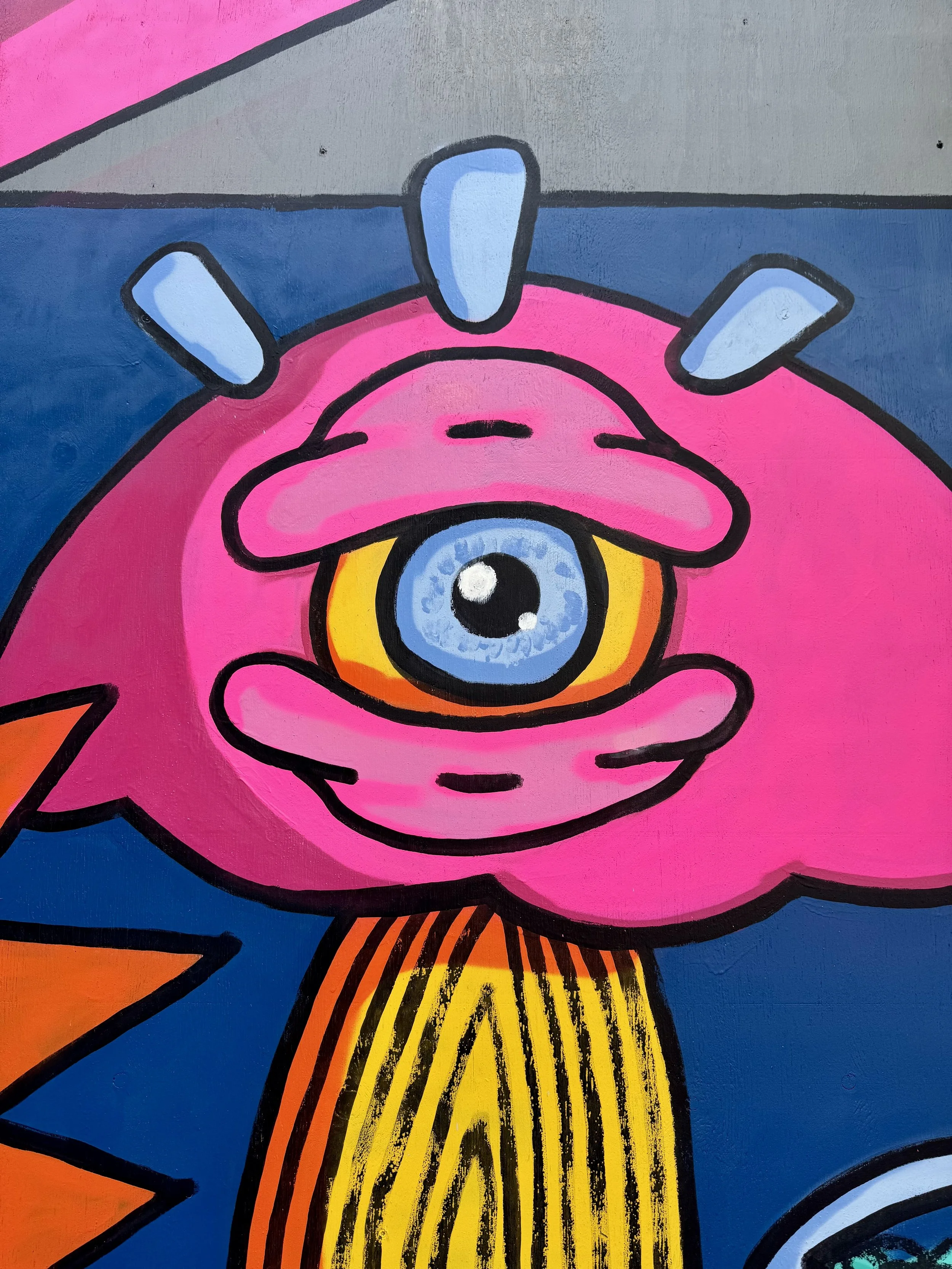 Painted for the Meeting of Styles graffiti festival, this mural marked a new chapter in my journey as an artist. Its surreal-pop imagery blends mushrooms, flowers, and cosmic energy—symbols of cycles, growth, and transformation—while reflecting my personal connection to Copenhagen, the first city where I painted abroad.